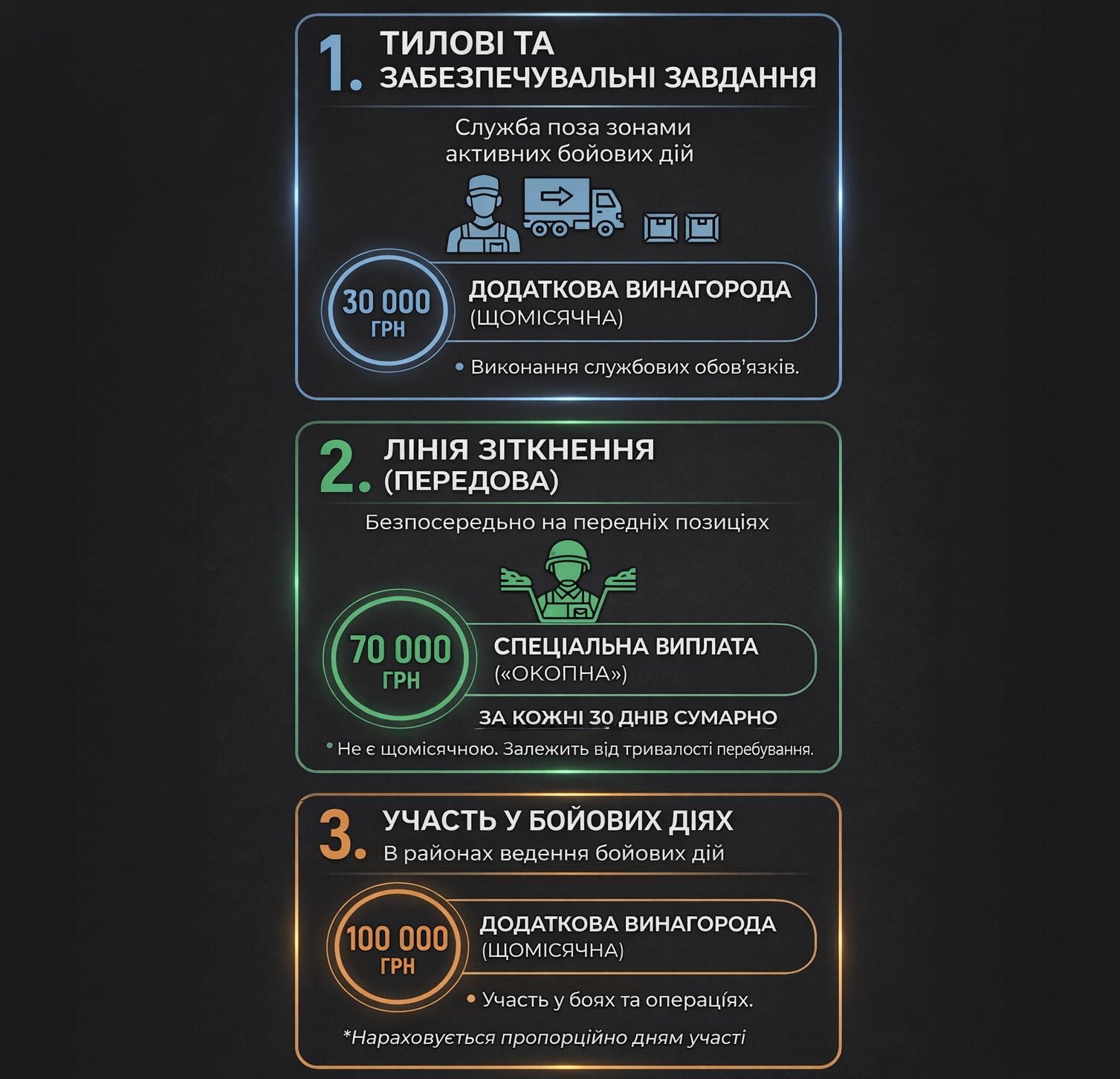 30 000 грн — додаткова винагорода для військовослужбовців, які виконують службові або бойові завдання в умовах воєнного стану, але поза районом активних бойових дій або на етапі забезпечення, підготовки чи відновлення підрозділу.